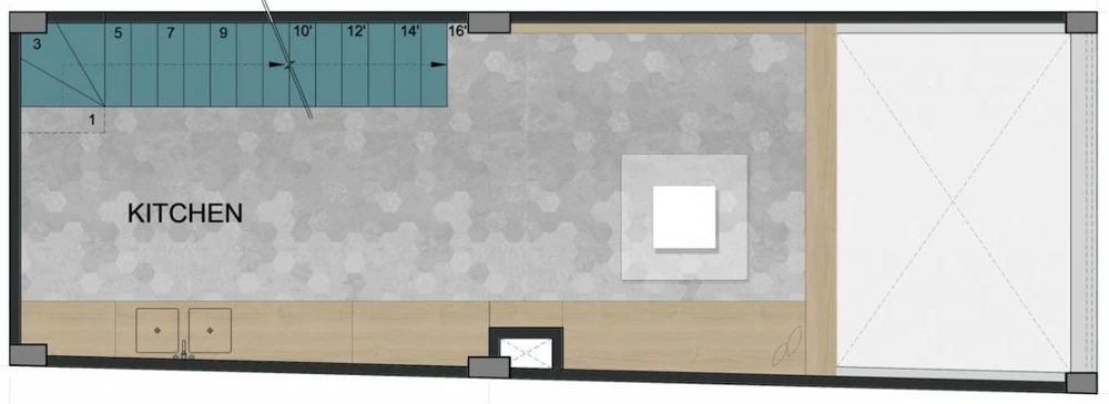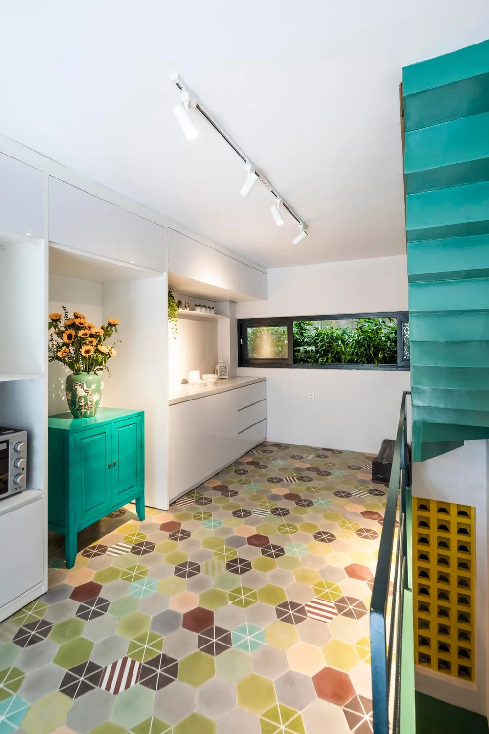 Tầng lửng là khu vực bếp và phòng ăn được bố trí tối giản, gọn gàng; với điểm nhấn là chiếc tủ màu xanh ngọc.