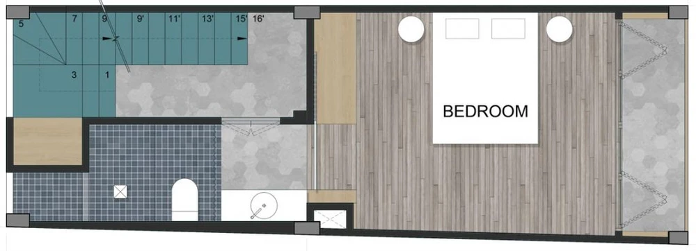 Trục cầu thang bố trí cặp một bên và nằm ở nửa phía sau ngôi nhà. Lên đến tầng 2, vị trí cầu thang lại chuyển về nửa phía trước.