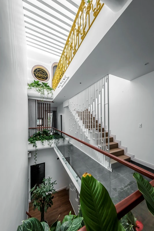 Lan can nối các cầu thang dẫn lên các tầng với nhiều kiểu thiết kế và màu sắc khác nhau tạo điểm nhấn cho nhà.