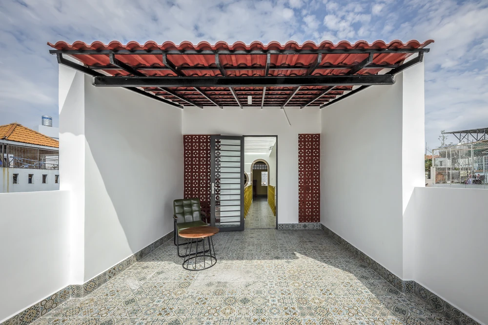 Phần tầng sân thượng KTS Story Architecture lấy cảm hứng từ những chi tiết, vật liệu và màu sắc truyền thống văn hóa của các kiến trúc cha ông. Những màu sắc này phối với không gian hiện đại, tạo cảm giác ấm cúng thân quen khi bước lên khu vực thờ cúng tâm linh.