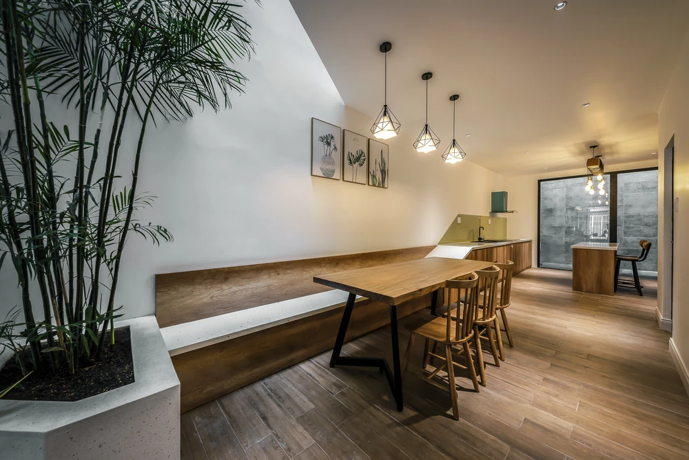 Nối liền với phòng khách là phòng ăn và bếp. Các không gian này liên thông với nhau, không có sự phân chia bởi vách ngăn nào.