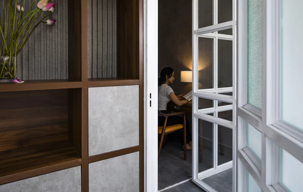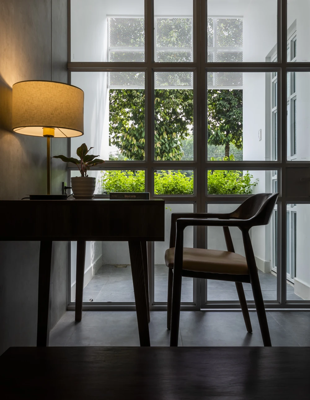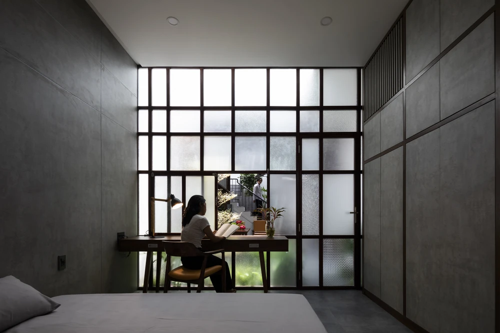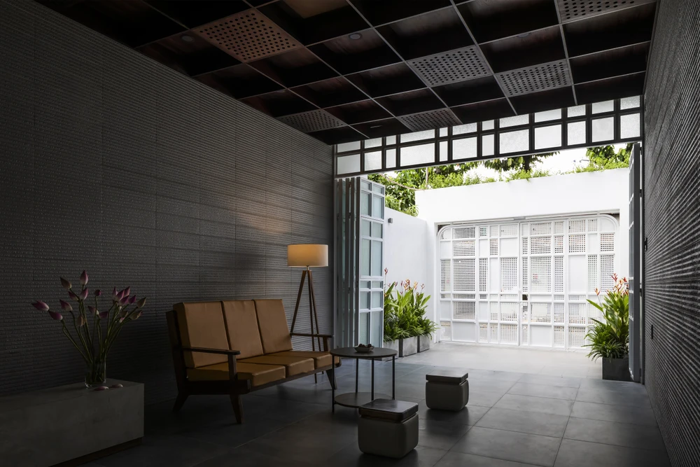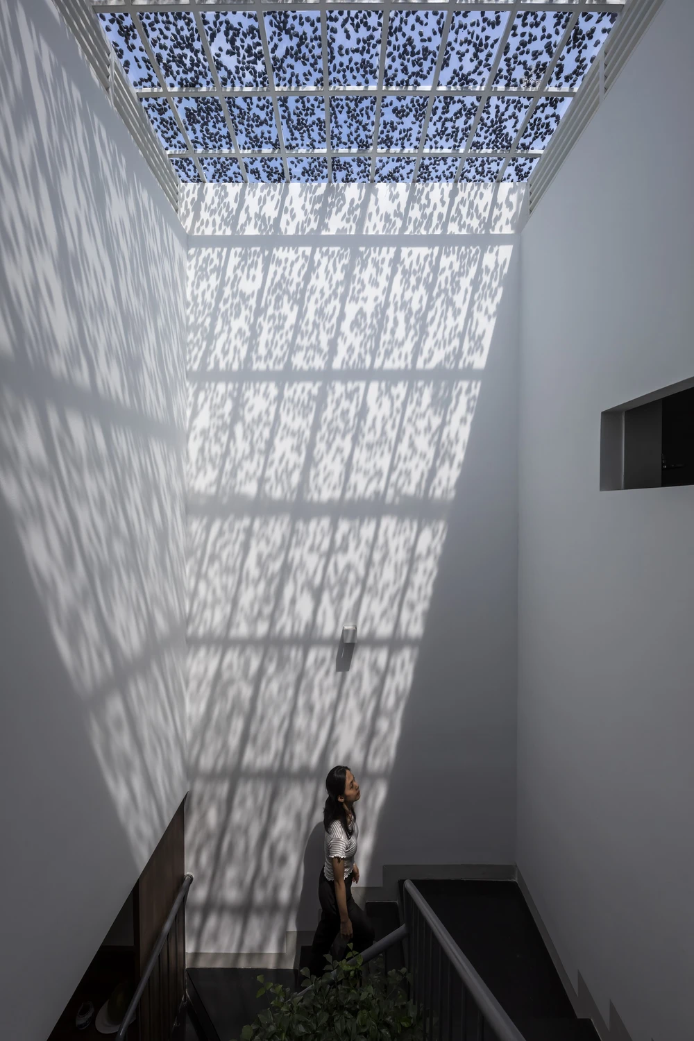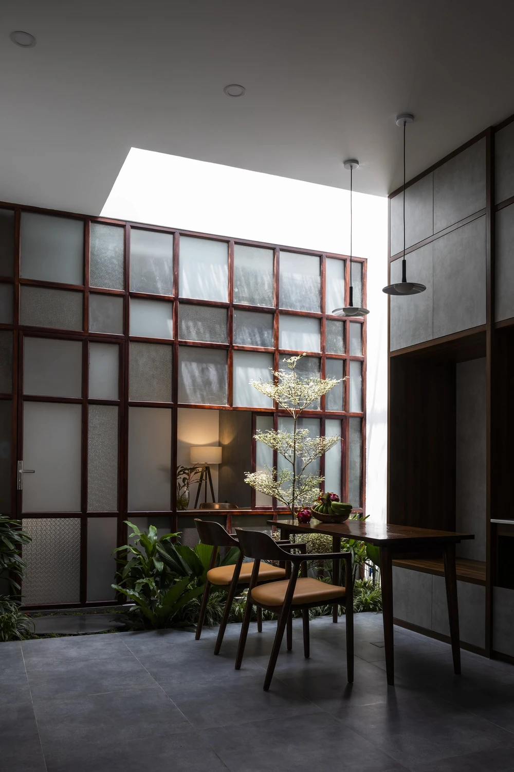 Hệ lam chữ Z bố trí ở phía trên giếng trời giúp thoát khí nóng, từ đó làm giảm áp suất bên dưới mái kính. Không khí vào nhà từ hai hệ cửa trước và sau, tạo ra dòng đối lưu luân chuyển qua mọi không gian.