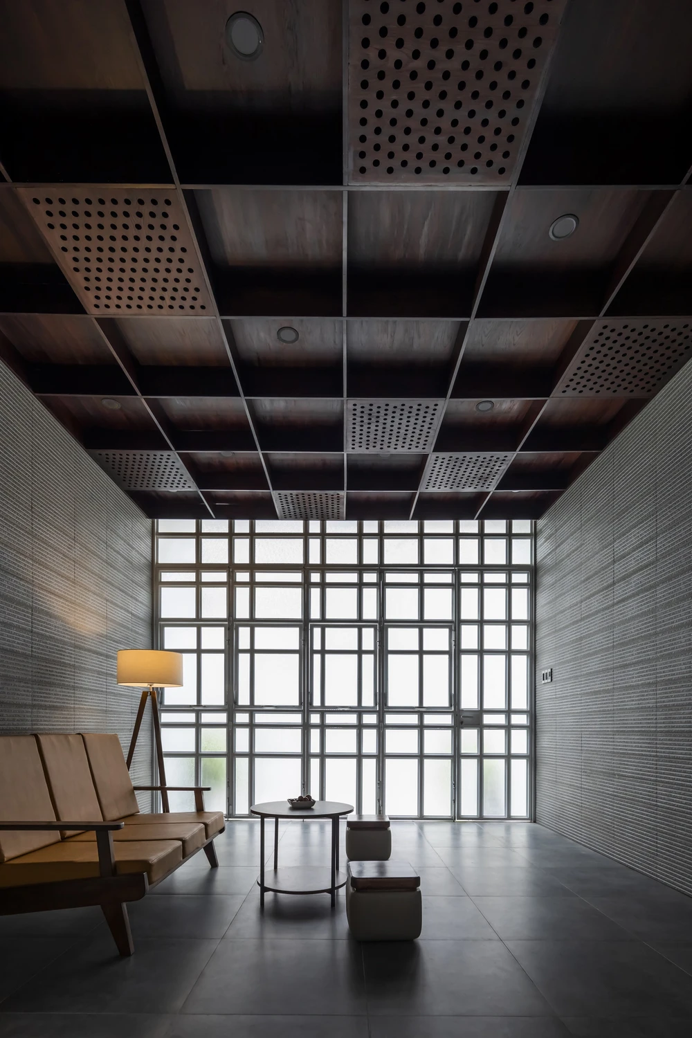 Thứ tư, vật liệu hoàn thiện tường trong nhà được chọn là những vật liệu có bề mặt gồ ghề và hệ trần cũng được thiết kế thành hệ khung rỗng, có bề dày.