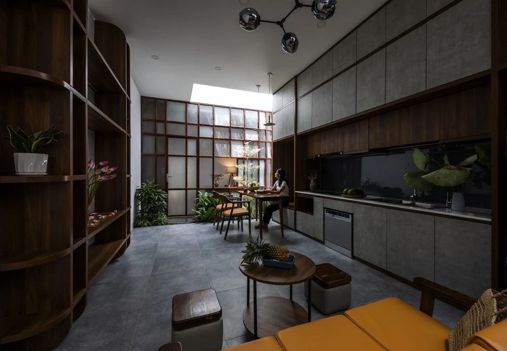 Giải pháp thứ ba là kiến trúc sư bố trí công năng để thiết lập hai trục thông thoáng tự nhiên theo phương đứng và phương ngang. Theo đó, tất cả các không gian trong nhà phố đều được thông thoáng tự nhiên.