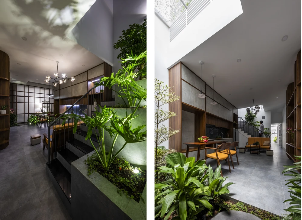 Với nhà phố hẹp về chiều ngang và cách xây trải dài, chia phòng thông thường sẽ gây thiếu sáng, khả năng thông gió và chống ồn kém. Đồng thời nhà phố sẽ không đủ khoảng không gian xanh cho sở thích của gia chủ.