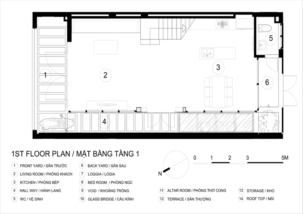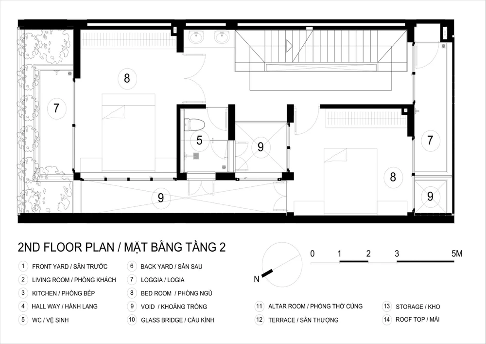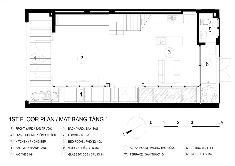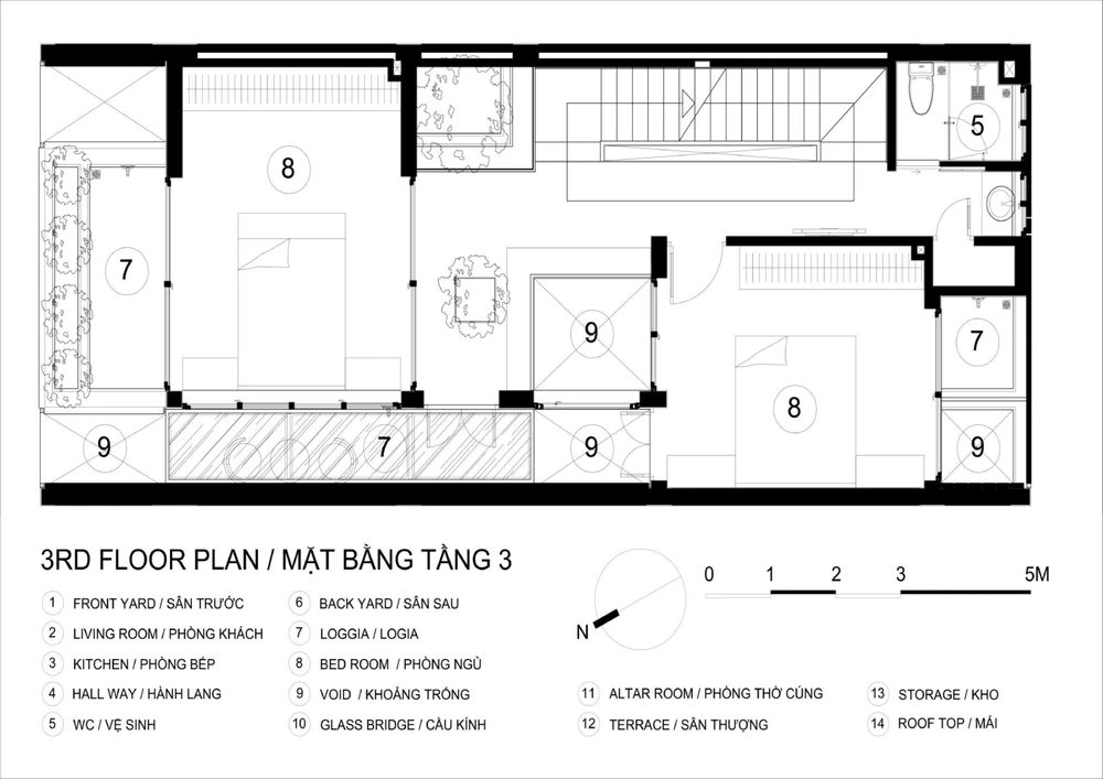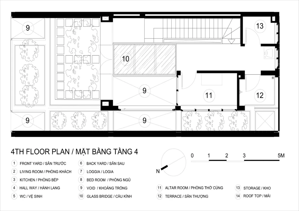Ngôi nhà có bốn tầng với hai khối chức năng chính được liên kết với nhau qua cầu thang bộ và không gian nghỉ ngơi.