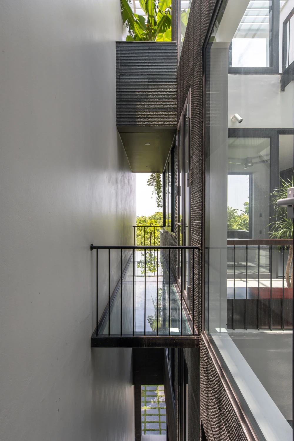Khối công năng phía trước được lùi vào 2m để có ban công đua ra trồng cây tạo bóng mát giúp hạn chế nắng trực tiếp vào buổi trưa và chiều.