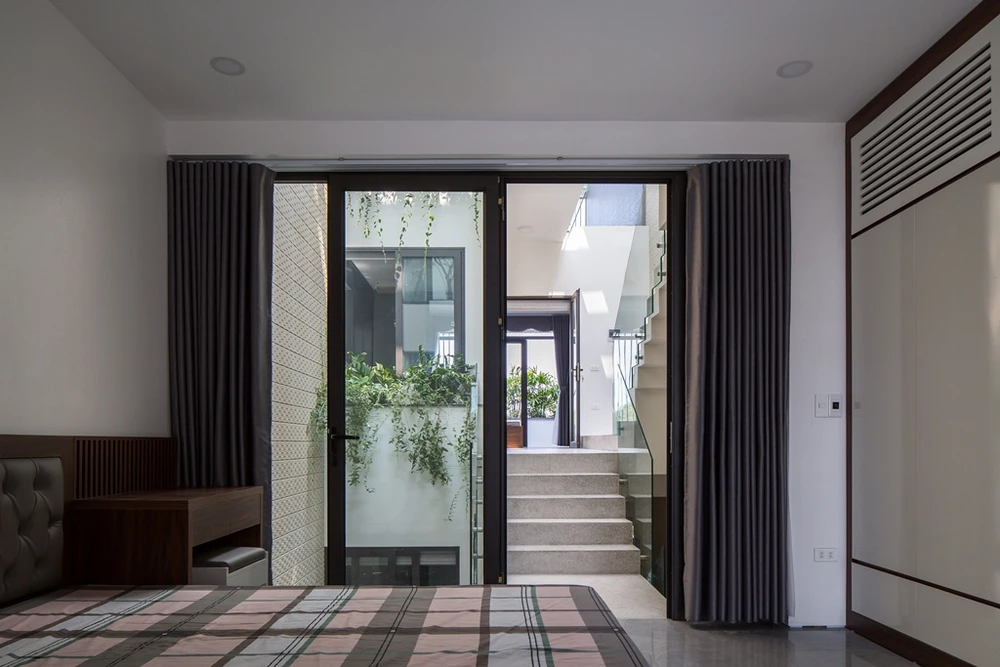Một giếng trời nhỏ được bố trí phía sau nhà giúp đảm bảo sự cân bằng cảnh quan giữa các tầng, giúp tăng giả năng đối lưu gió, làm mát không gian, tăng tính kết nối và giúp thoát hiểm nhanh hơn khi gặp sự cố.