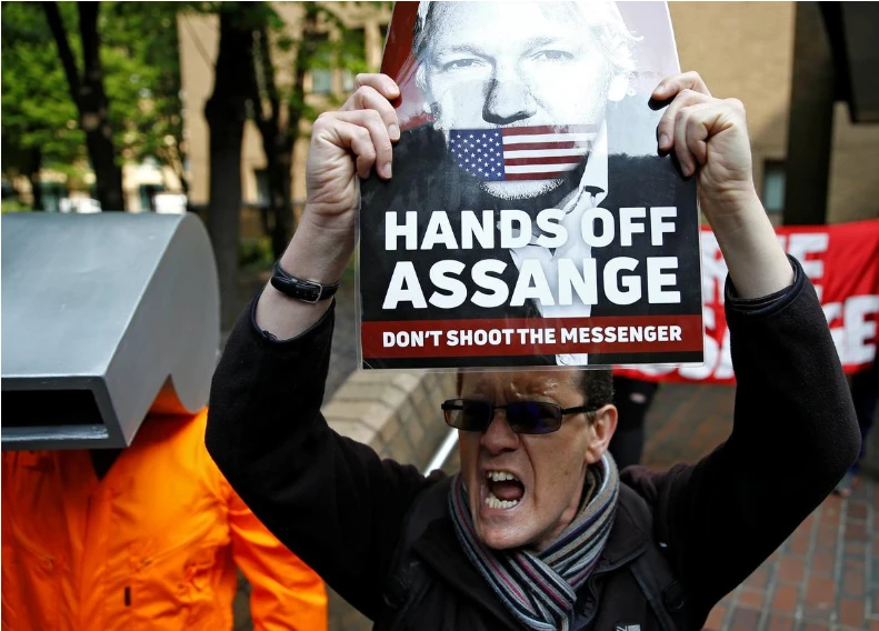Mọi người phản đối bên ngoài Tòa án Southwark Crown, nơi Julian Assange, người sáng lập WikiLeaks sẽ bị kết án, tại London, Anh hôm ngày 1-5. Ảnh: REUTERS