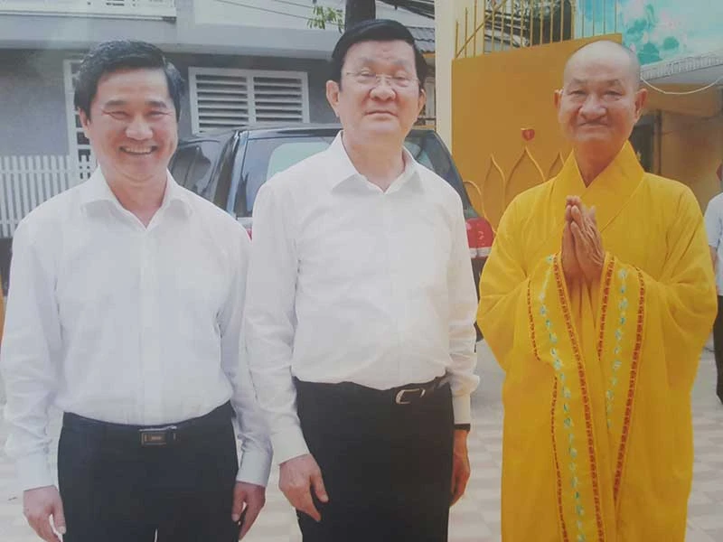 Nguyên Chủ tịch nước Trương Tấn Sang và ông Huỳnh Văn Hạnh, Giám đốc Sở Tư pháp TP.HCM, trong một lần thăm chùa Pháp Giới và sư thầy Thích Huệ Văn. Ảnh: Nhân vật cung cấp