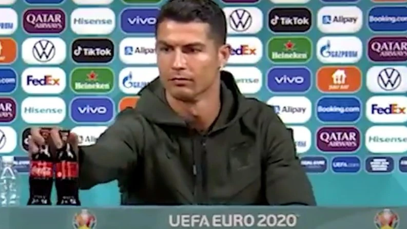 Trong buổi họp báo trước trận đấu Hungary-Bồ Đào Nha, bước vào phòng họp báo và ngồi xuống ghế, Ronaldo đã dùng tay gạt hai chai nước Coca- Cola khỏi tầm “zoom” của ống kính rồi cầm chai nước lọc nói “Hãy uống nước”.