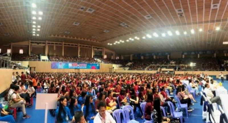 Hàng ngàn sinh viên, giảng viên Trường ĐH Nguyễn Tất Thành đã có mặt tại Nhà thi đấu Quân khu 7 để cổ vũ cho đội tuyển Việt Nam, trận tứ kết Việt Nam-Syria. Ảnh: AN NHIÊN