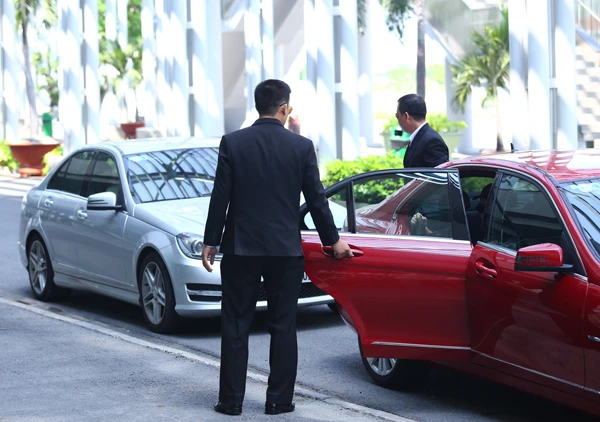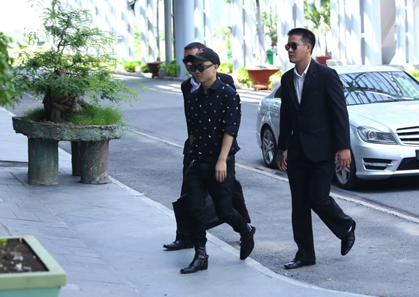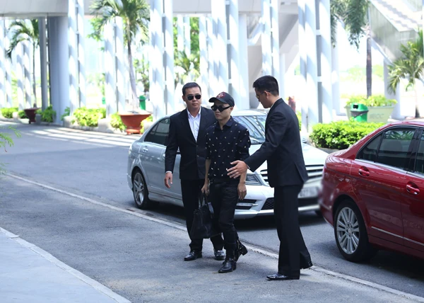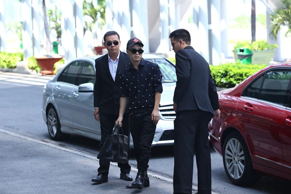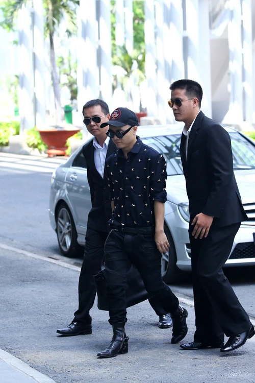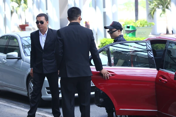 Nhà thiết kế được hai vệ sĩ cao to tháp tùng, bảo vệ nghiêm ngặt.