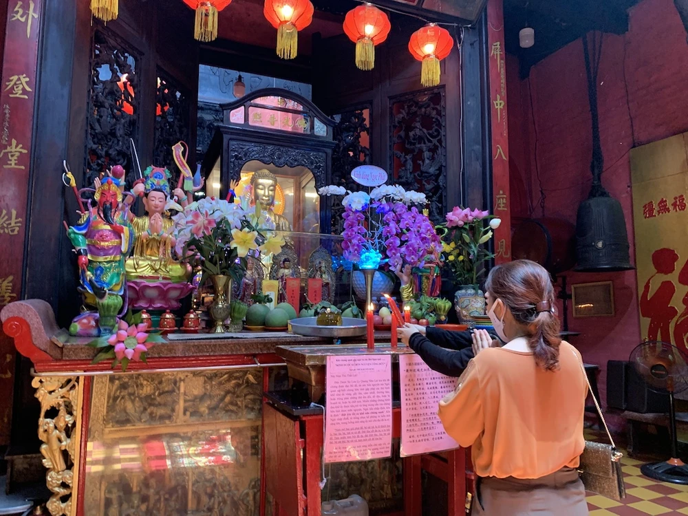 Phật tử đến chùa lễ Phật nên đeo khẩu trang và tuân thủ các quy định về phòng, chống COVID-19. Trong ảnh: Phật tử lễ Phật tại chùa Phước Hải, quận 1 ngày rằm tháng tư. Ảnh: Q.T