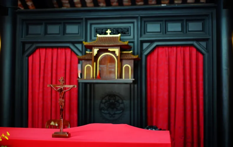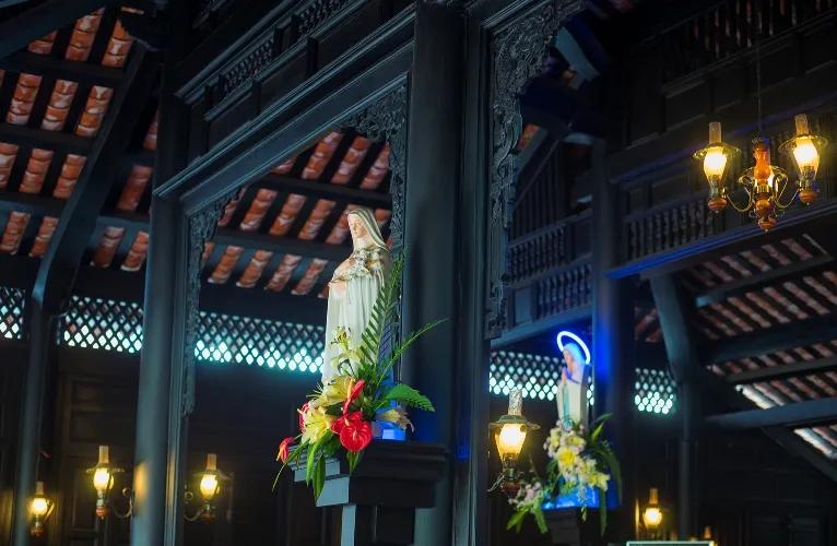 Các họa tiết gỗ trong nhà nguyện đều được chạm trổ hoa văn đẹp. Trên cao của gian giữa là một khám thờ bằng gỗ chạm trổ “song phượng triều dương” cùng các hoa văn hoa lá. Bàn thờ gồm tượng Chúa Giêsu cùng thánh Giuse và Đức Mẹ nhưng hai bên có cặp câu đối bằng chữ Hán lấy ý từ sách Trung Dung của Khổng Tử: Thần chi cách tư, Đức kỳ thạch hĩ (việc thần thánh không thể lường được, đức của thần thánh thật thịnh thay).