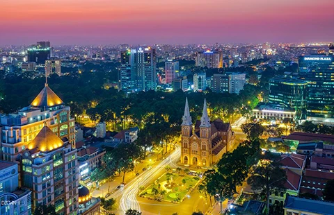 Nhà thờ Đức Bà Sài Gòn đang bị các công trình xung quanh lấn át chiều cao, làm mất sự hài hòa tổng thể kiến trúc. Ảnh: NINH DOÃN HIẾU