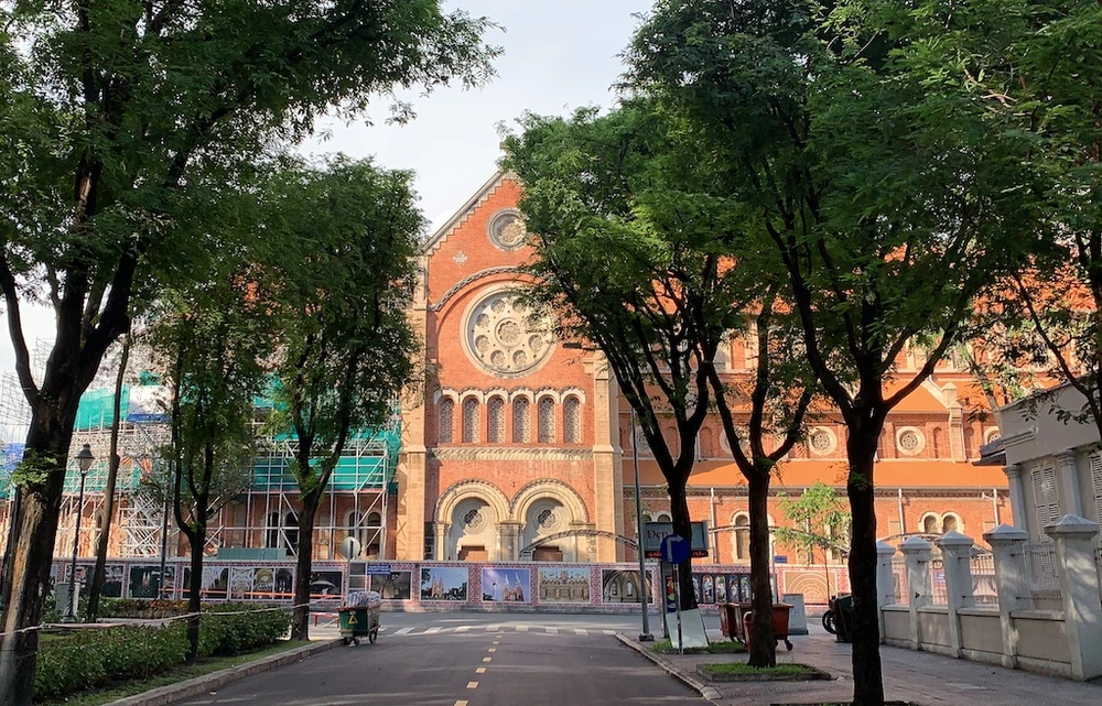 Nhà thờ Chính toà Đức Bà Sài Gòn từ hướng đường Hàn Thuyên trong những ngày giãn cách xã hội vì COVID-19. Ảnh: Quỳnh Trang