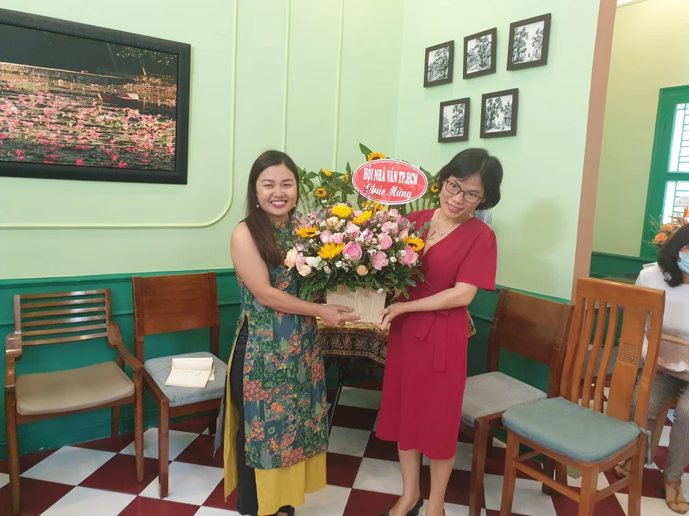 Đại diện Hội Nhà văn TP.HCM tặng hoa cho nhà thơ Hạnh Ngộ. Ảnh: NGUYỄN HÀ.