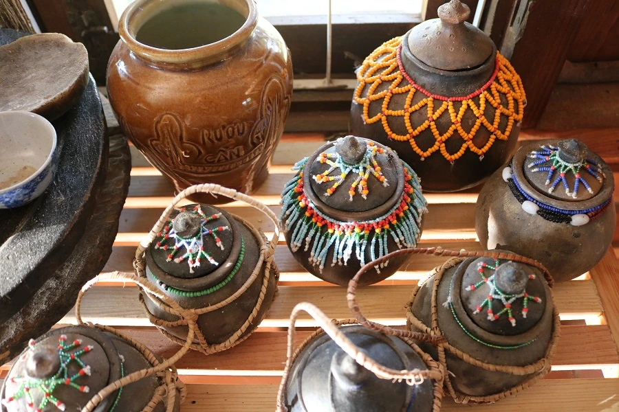 Những ấm nước với kiểu trang trí mang đậm bản sắc của người Chu Ru. Ảnh: THANH TUYỀN