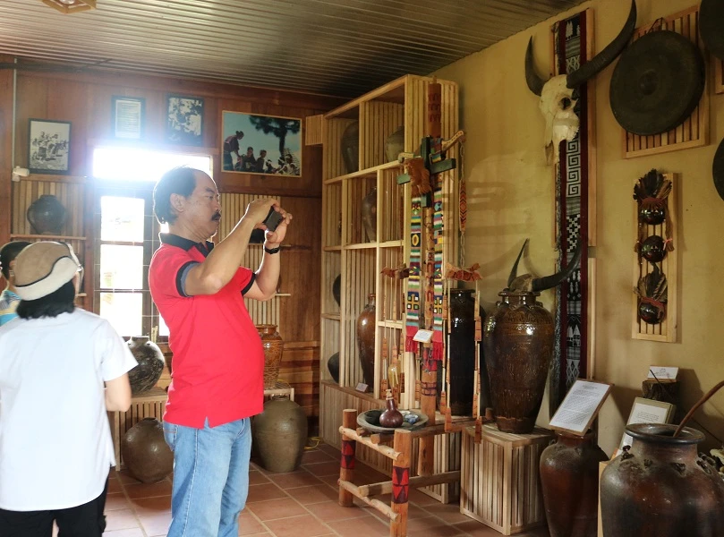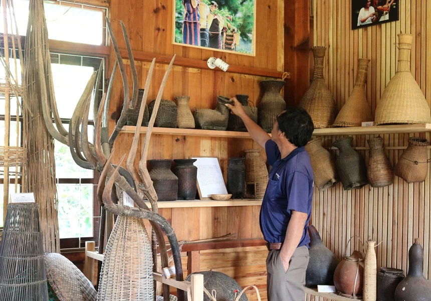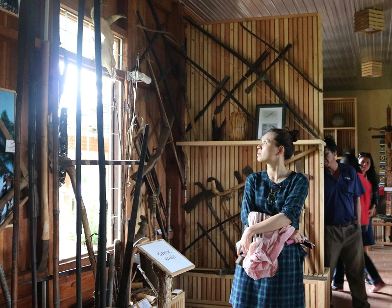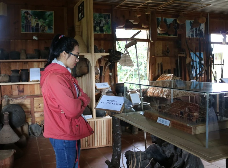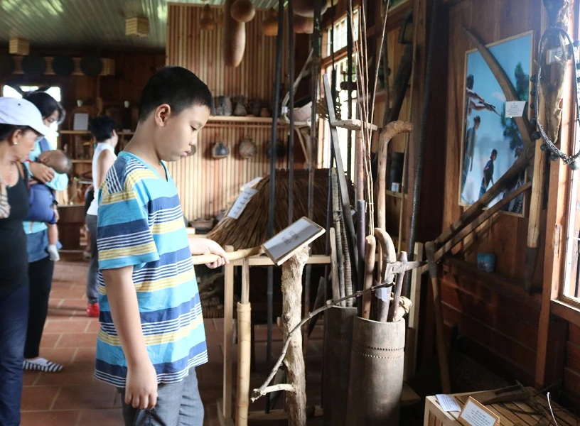 Khách đến tham quan có thể tìm hiểu về tập tục của người Chu Ru thông qua các hiện vật và lời kể được ghi trên mỗi vật dụng. Ảnh: THANH TUYỀN
