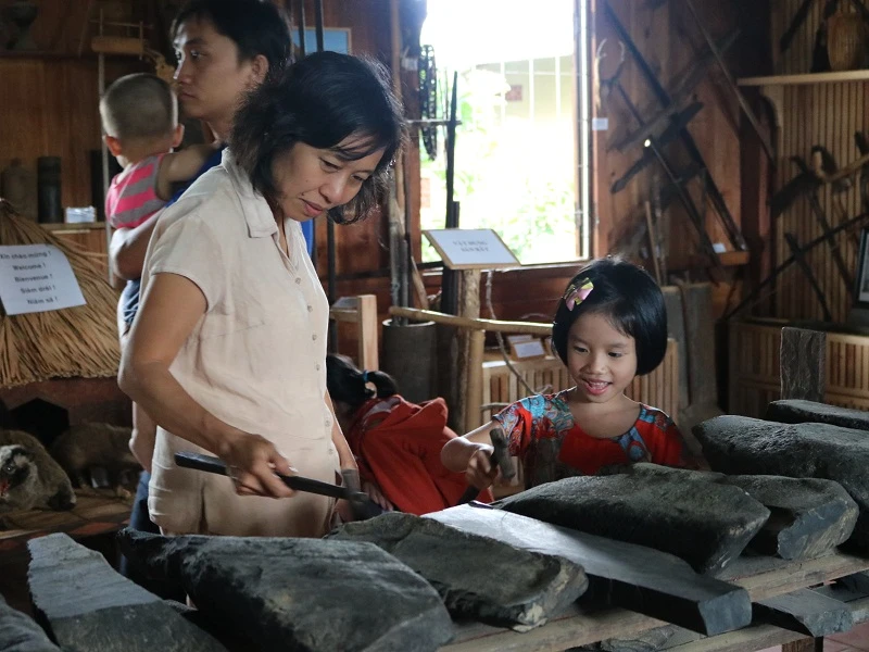 Khách tham quan thích thú với nhạc cụ bằng đá của người Chu Ru. Ảnh: THANH TUYỀN