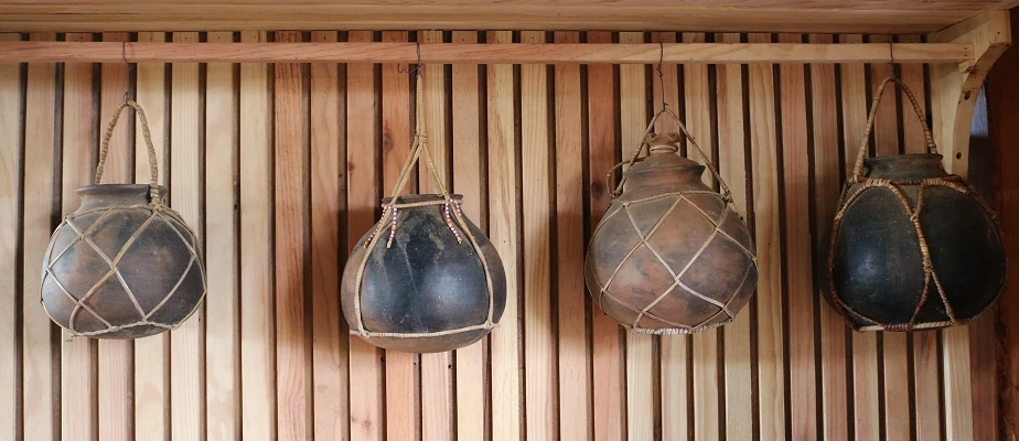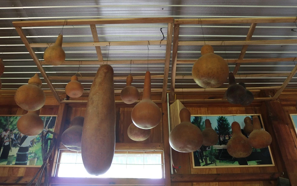 Những vật dụng làm từ trái bầu, bí khô được người Chu Ru dùng treo trong gian nhà của mình. Ảnh: THANH TUYỀN