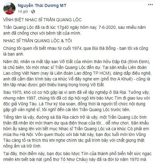 Trên trang cá nhân, nhà thơ Nguyễn Thái Dương chia sẻ bài viết "Nhạc sĩ Trần Quang Lộc và tôi":
