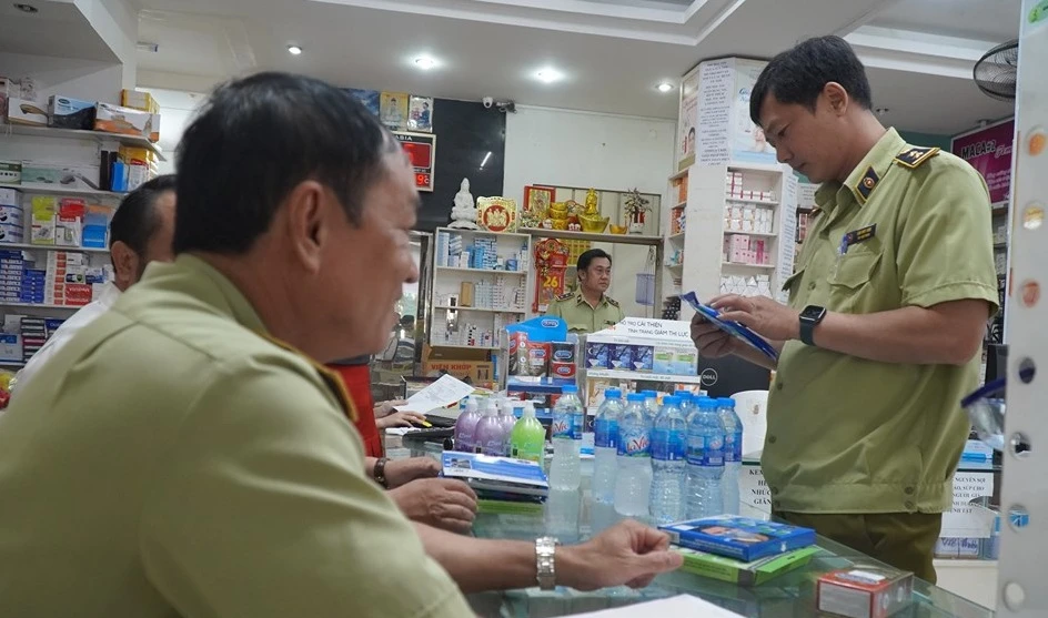 Lực lượng quản lý thị trường Đồng Nai kiểm tra và làm việc tại nhà thuốc Sơn Minh.