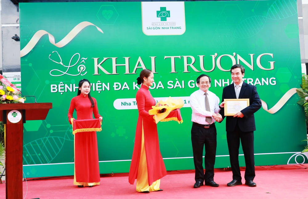 Tiến sĩ, bác sĩ Lê Tấn Phùng (áo trắng), Phó giám đốc Sở Y tế Khánh Hòa trao giấy phép cho bác sĩ CKII Nguyễn Thành Hưng, giám đốc BVĐK Sài Gòn – Nha Trang. Ảnh: TC