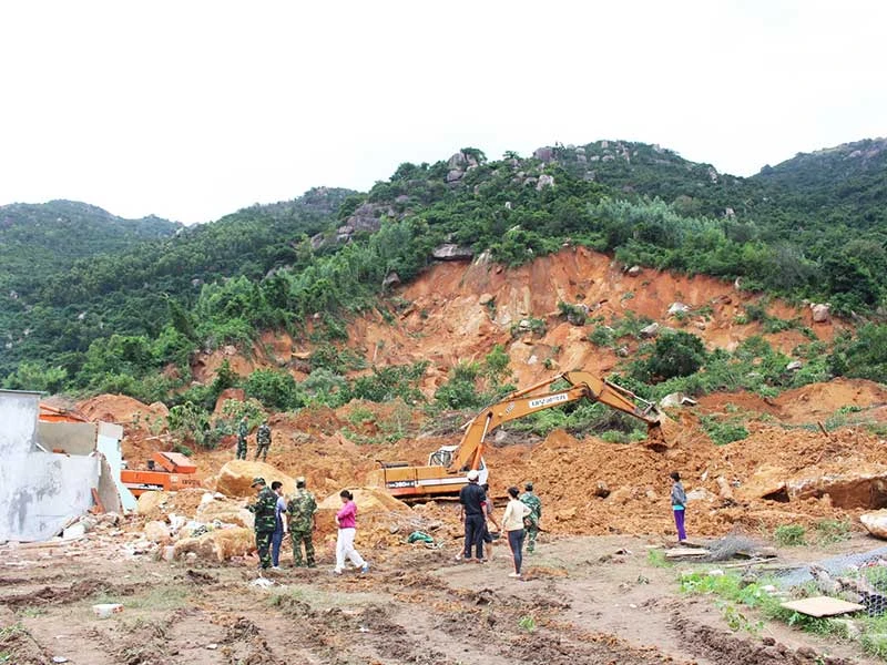 | Núi bị hổng chân Khi quan sát trực tiếp tại hiện trường vụ sạt lở, ông Đào Công Thiên, Phó Chủ tịch UBND tỉnh Khánh Hòa, cũng thừa nhận nguyên nhân sạt lở một phần do nạn lấy đất làm công trình, chẻ đá khiến núi bị hổng chân. “Chân núi bị hổng mất, áp lực từ trên đè xuống, cùng với lượng mưa rất lớn nên dẫn đến sạt lở lớn như vậy” - ông Thiên phân tích. |