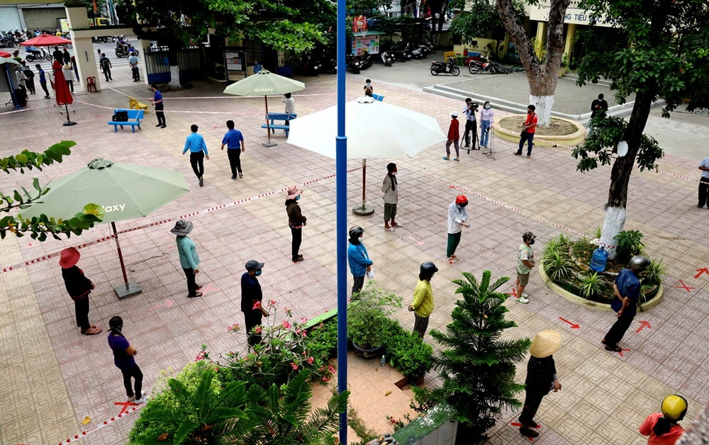 Người dân xếp hàng nhận gạo trong khuôn viên Trường Tiểu học Phước Tiến.