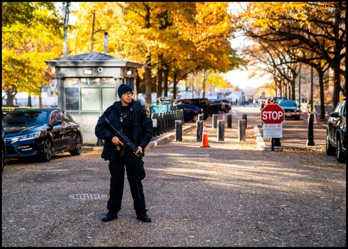 Một sĩ quan Mật vụ đứng gác ngoài Nhà Trắng vào lúc khu vực này bị phong tỏa. Ảnh: THE NEW YORK TIMES