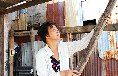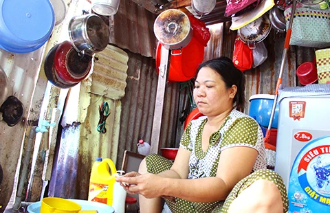 Chị Nguyễn Thị Chung (phường 4, quận 8) trong căn nhà lụp xụp, nơi trú ngụ nhiều thế hệ. Ảnh: LT