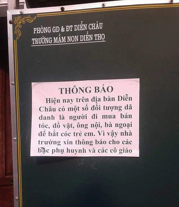 "Hiện nay, trên địa bàn huyện Diễn Châu có một số đối tượng giả danh là người đi mua bán tóc, đồ vặt, ông nội, bà ngoại để bắt cóc trẻ em. Vì vậy nhà trường xin thông báo cho các bậc phụ huynh và các cô giáo".
