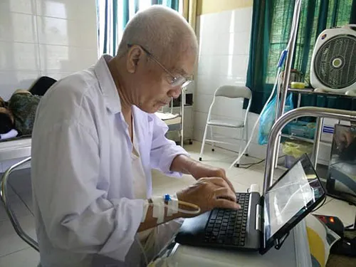 Tuy bệnh nhưng ông vẫn lạc quan viết văn trên giường bệnh. Đây là hình ảnh mới nhất ông đang điều trị căn bệnh ung thư phổi tại Quân y 103 Hà Nội.