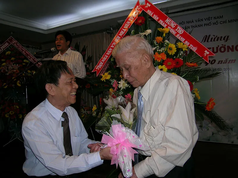 Nhà văn Trần Thanh Giao (thứ 2 từ phải sang), biên tập viên thời kỳ đầu của báo và luật sư-TS Phan Đăng Thanh (giữa). Ảnh tư liệu báo Pháp Luật TP.HCM Tác phẩm đã xuất bản: - Dòng sữa (truyện ngắn, 1962); - Đi tìm ngọc (truyện 1964, 1972, 1987, 2002); - Cầu sáng (tiểu thuyết 1976, 1985); - Đất mới vỡ (tiểu thuyết 1978, 1981); - Giữa hai làn nước (truyện 1979); - Sao Mai gần gũi (truyện và ký 1983); - Một vùng sông nước (truyện 1985); - Thị trấn giữa rừng Sác (bút ký 1985); - Bầu trời thềm lục địa (bút ký 1986); - Câu chuyện một chiều thứ Bảy (truyện ngắn 1987); - Một thời dang dở (tiểu thuyết 1988, 1992); - Thời áo trắng (tiểu thuyết 1995, 2002); - Tuyển tập truyện ngắn (2002); - Ai vượt Cửu Long Giang (bút ký 2003); - Ai tri âm đó… (phê bình, tiểu luận…, 2003), - Văn học TP.HCM 1975-2005 (nghiên cứu, khảo luận…, 2008), - Chuông chùa (truyện ngắn 2011)... Giải thưởng văn học: - Giải thưởng truyện ngắn báo Thống nhất (1959) với Câu chuyện một chiều thứ Bảy; - Giải thưởng truyện ngắn báo Văn Nghệ (1960) với Dòng sữa; - Giải thưởng bút ký báo Sài Gòn giải phóng (1985) với Đường xe xuyên rừng Sác; - Giải thưởng bút ký Đài Tiếng nói Việt Nam (1986) với Bầu trời thềm lục địa; - Giải thưởng bút ký Bộ Giao thông vận tải (2000) với Ai vượt Cửu Long Giang trên cầu Mỹ Thuận... - Giải nhất Cuộc thi ký sự "40 năm - Những ký ức không thế nào quên", do báo Sài Gòn Giải Phóng và Hội Nhà văn TP.HCM tổ chức năm 2015. (Nguồn: theo website Hội Nhà văn TP.HCM) |