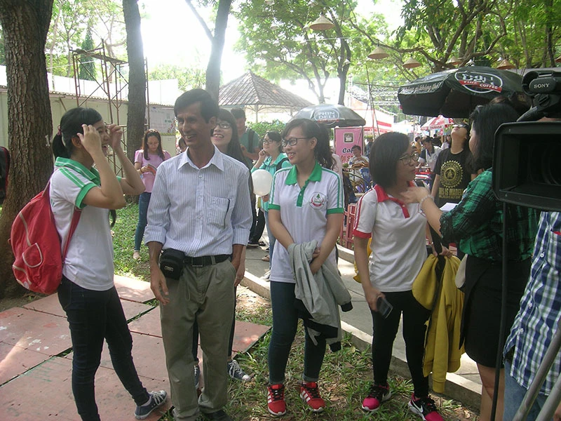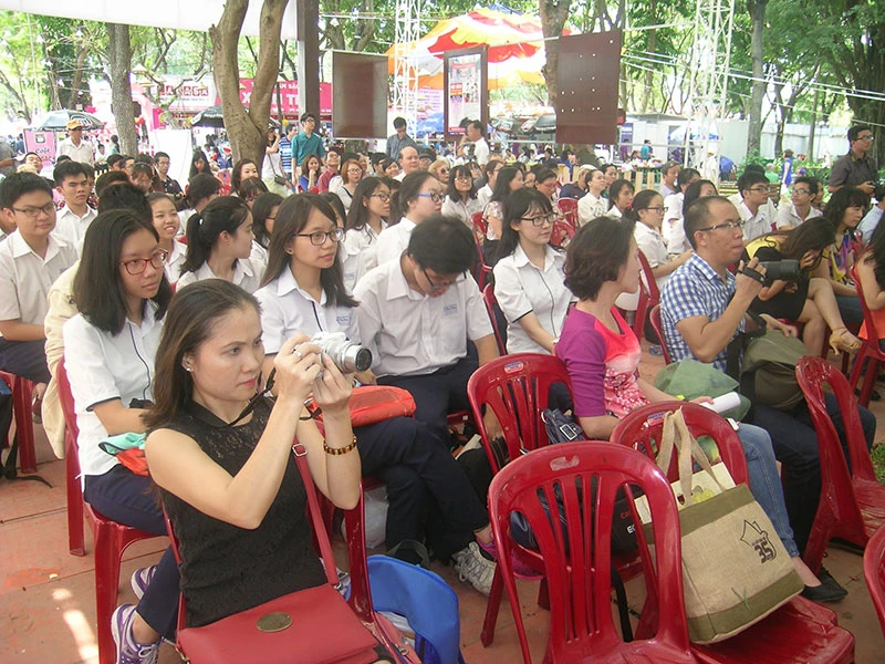 Các em học sinh lớp 11/1 Trường chuyên Lê Hồng Phong (TP.HCM) đến học hỏi giao lưu cùng đàn chị. Ảnh: NGUYỄN TÝ