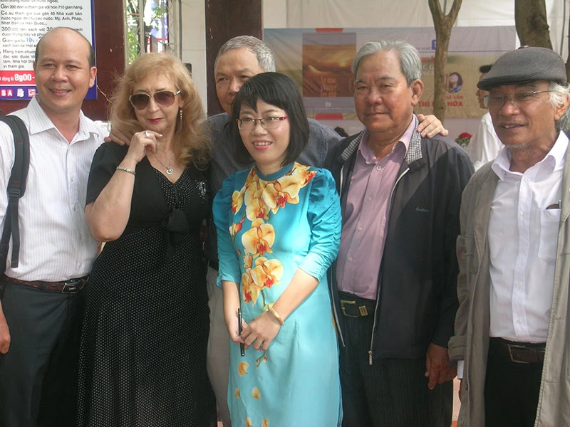 Các nhà văn, dịch giả chụp ảnh lưu niệm cùng tác giả trẻ đến từ miền quê Mộc mạc bánh canh. Ảnh: NGUYỄN TÝ