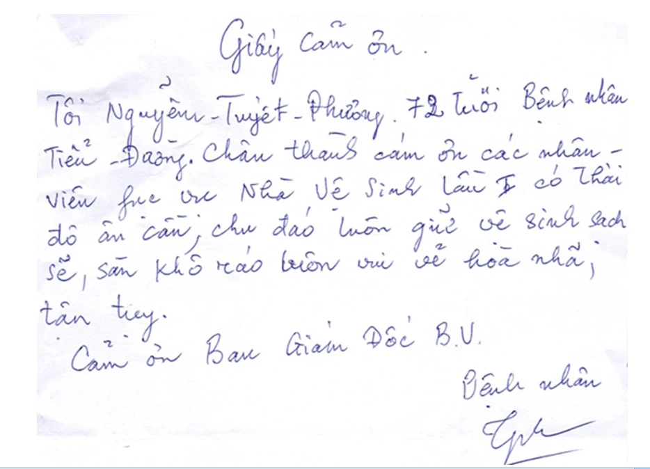 Nội dung thư cám ơn như sau: “Tôi Nguyễn Tuyết Phương, 72 tuổi, bệnh nhân tiểu đường. Chân thành cám ơn các nhân viên phục vụ nhà vệ sinh lầu một có thái độ ân cần, chu đáo. Luôn giữ vệ sinh sạch sẽ, sàn khô ráo, luôn vui vẻ hòa nhã, tận tụy. Cám ơn ban giám đốc BV”.