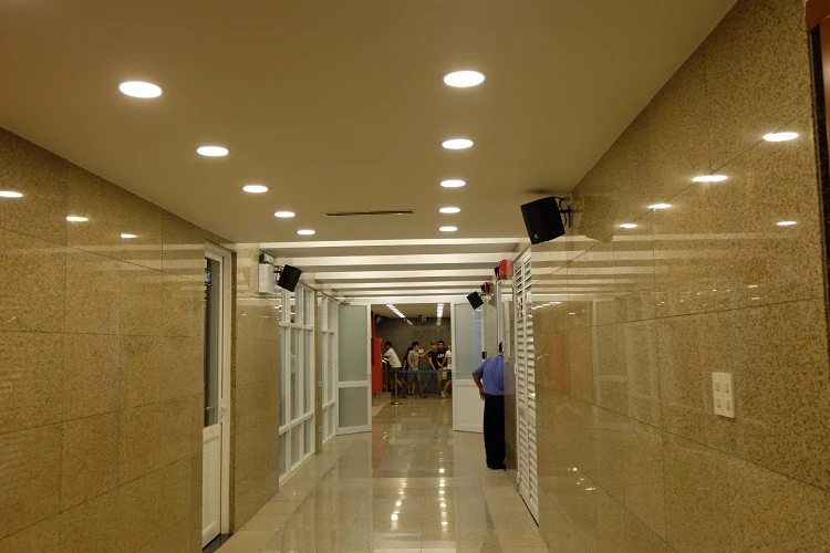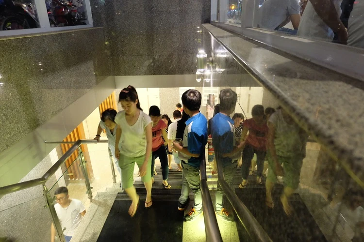 Lối lên xuống cầu thang có gắn nhiều đèn trang trí. Trên đầu cầu thang đi bộ xuống khu nhà vệ sinh được bố trí gạt tàn thuốc lá và thùng rác để phục vụ người dân.
