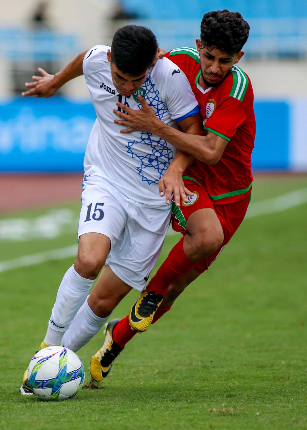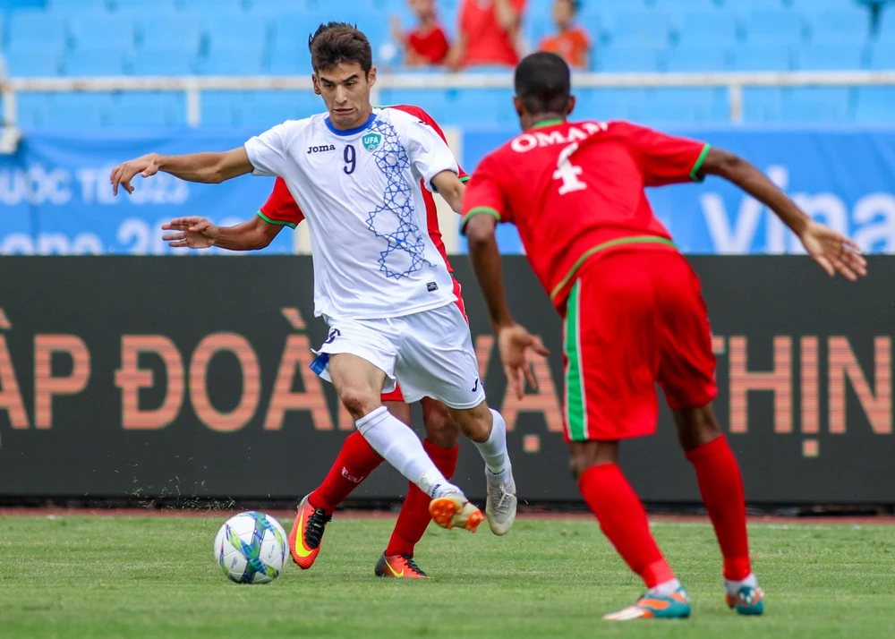 Pha tranh chấp của cầu thủ Oman trước tiền đạo Uzbekistan