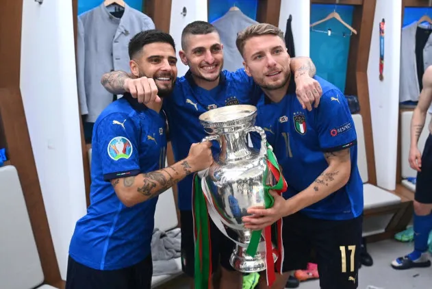 Verratti (giữa) cùng các đồng đội bên chiếc cúp vô địch Euro 2020. ẢNH: GETTY