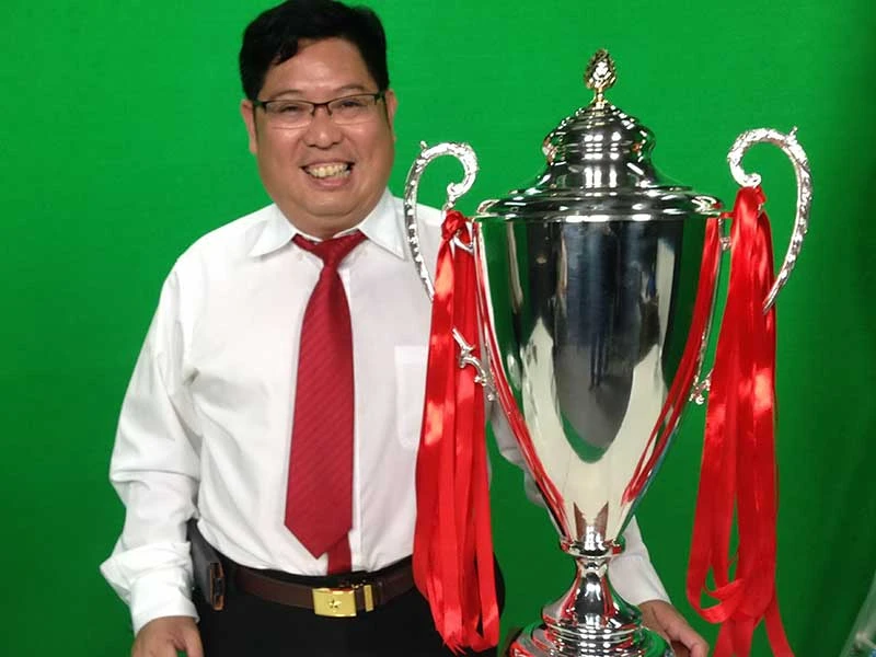 Anh Trần Song Hải, một trong những CĐV có sáng kiến tổ chức gala trao cúp “cho nhà vô địch trong lòng người hâm mộ”, bên chiếc cúp mới chuyển từ Ý về. Ảnh: CTV