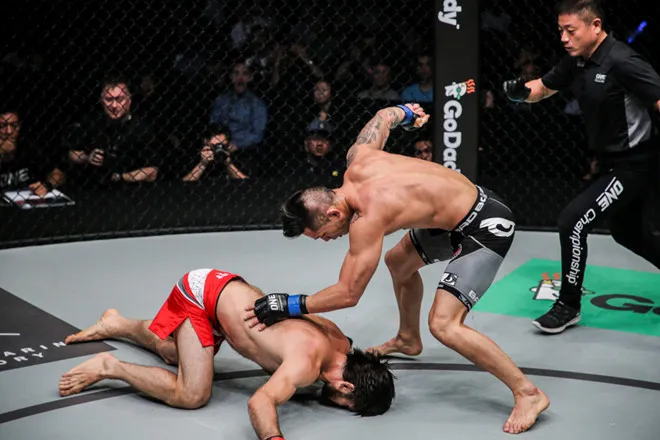 Trận Martin Nguyen (quần xám) hạ KO "chiến binh gieo rắc chết chóc châu Á" Christian Lee của Singapore.