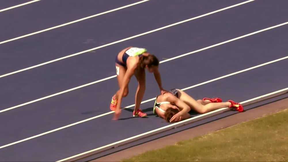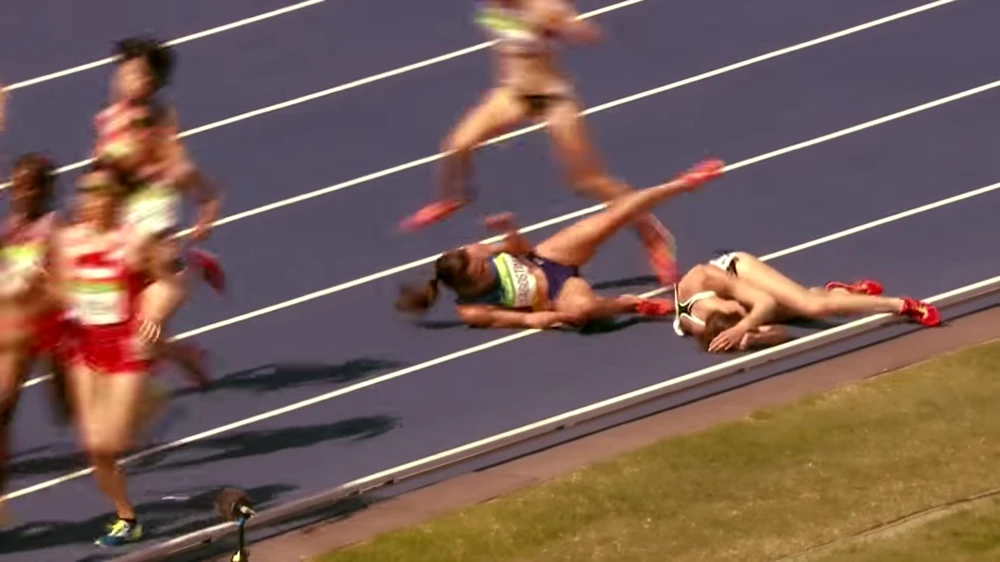 Đứng dậy ngay và chuẩn bị đuổi theo đoàn đua, chị thấy Hamblin nằm đau đớn và tay đua người Mỹ đã dừng lại để đỡ bạn chạy đứng dậy chinh phục tiếp đường đua. Không ngờ khi cả hai đứng dậy thì Agostino lại phát hiện cổ chân mình bị chấn thương rất nặng.