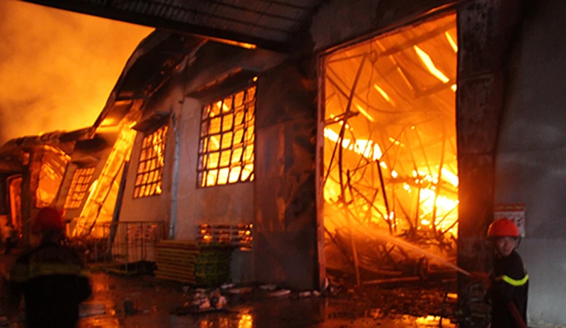 Đám cháy bao trùm toàn bộ khu nhà xưởng chứa hàng thành phẩm. Ảnh: TRỌNG LỢI