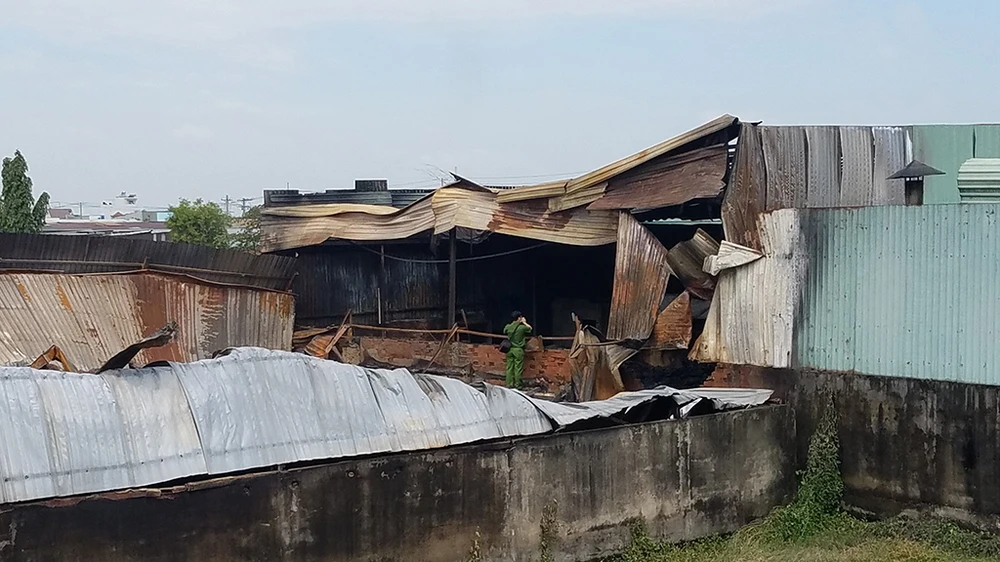 Ngày 8-11, Công an huyện Bình Chánh, TP.HCM vẫn đang phong tỏa, khám nghiệm hiện trường vụ cháy nhà xưởng xảy ra trên địa bàn.