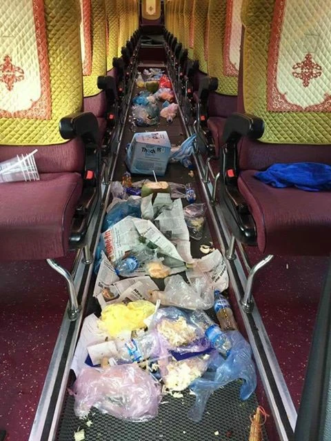 Trên xe, hai mẹ con ăn uống liên tục. Điều ấy thì cũng được thôi nhưng họ cứ xé bịch bánh, mở chai nước là xả ngay xuống sàn xe. Mặc dù trước mặt có túi đựng rác nhưng cả mẹ và con không ai ngó tới. Đến trạm dừng chân, trước khi xuống xe, do không chịu được, tôi đã sẵn tay dọn dùm mớ rác cho hai mẹ con.
