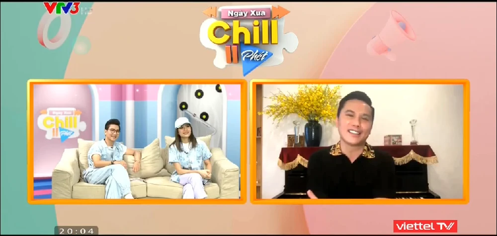 Nhạc sĩ Anh Tú và MC Phí Linh cùng MC Công Tố tại Ngày xưa chill phết. Ảnh: Chụp màn hình.