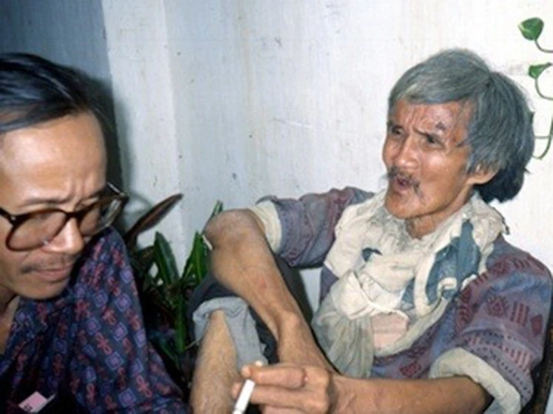 Cố thi sĩ Bùi Giáng (phải) và cố nhạc sĩ Trịnh Công Sơn trong một lần hội ngộ. (Ảnh tư liệu)